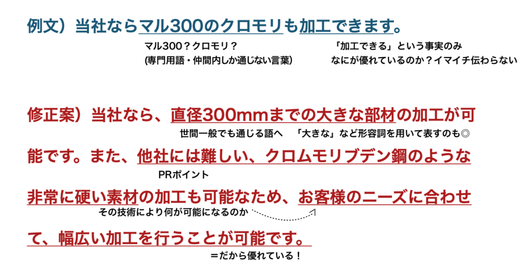 ここから分かるように、「専門用語や仲間内しか通じない言葉、省略された語を避けること」「伝えたいこと(製品の強み・どんな価値が提供できるか 等)を整理し、具体的に記載すること」が他者に理解してもらう上で重要となってきます。