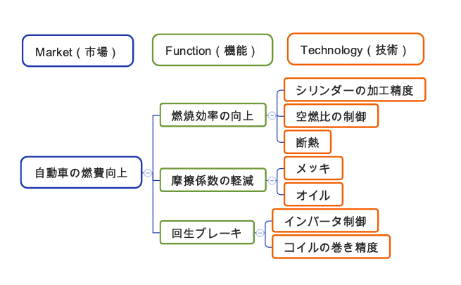 このフレームワークの便利なところは、技術と市場の結びつきだけではなく、その間に機能が入っていることです。MFTフレームワークを使うことで、技術を使う機能と、機能が必要な市場との関係性を簡単にまとめることができます。