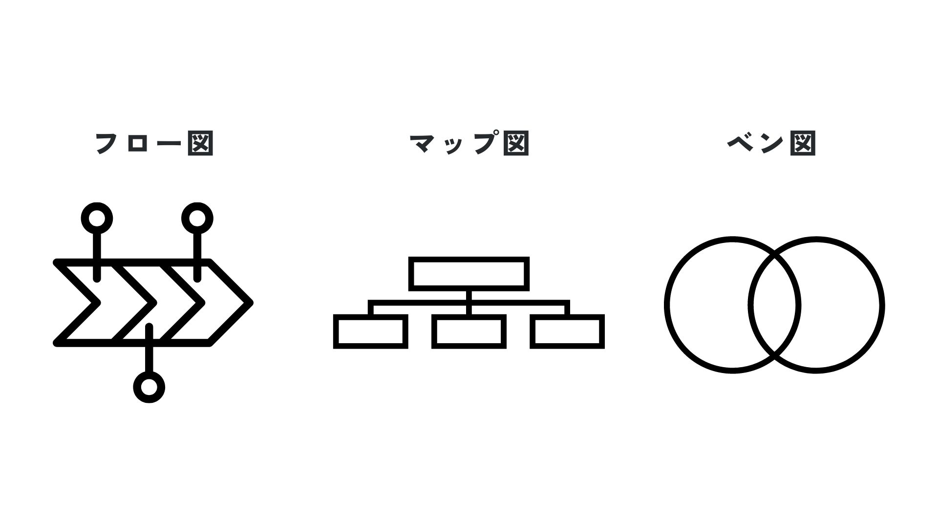 よって、図解とテキストのバランスを意識して作成しましょう。よく使う図解として、フロー図、マップ図、ベン図があります。適切な箇所で使ってみてください。